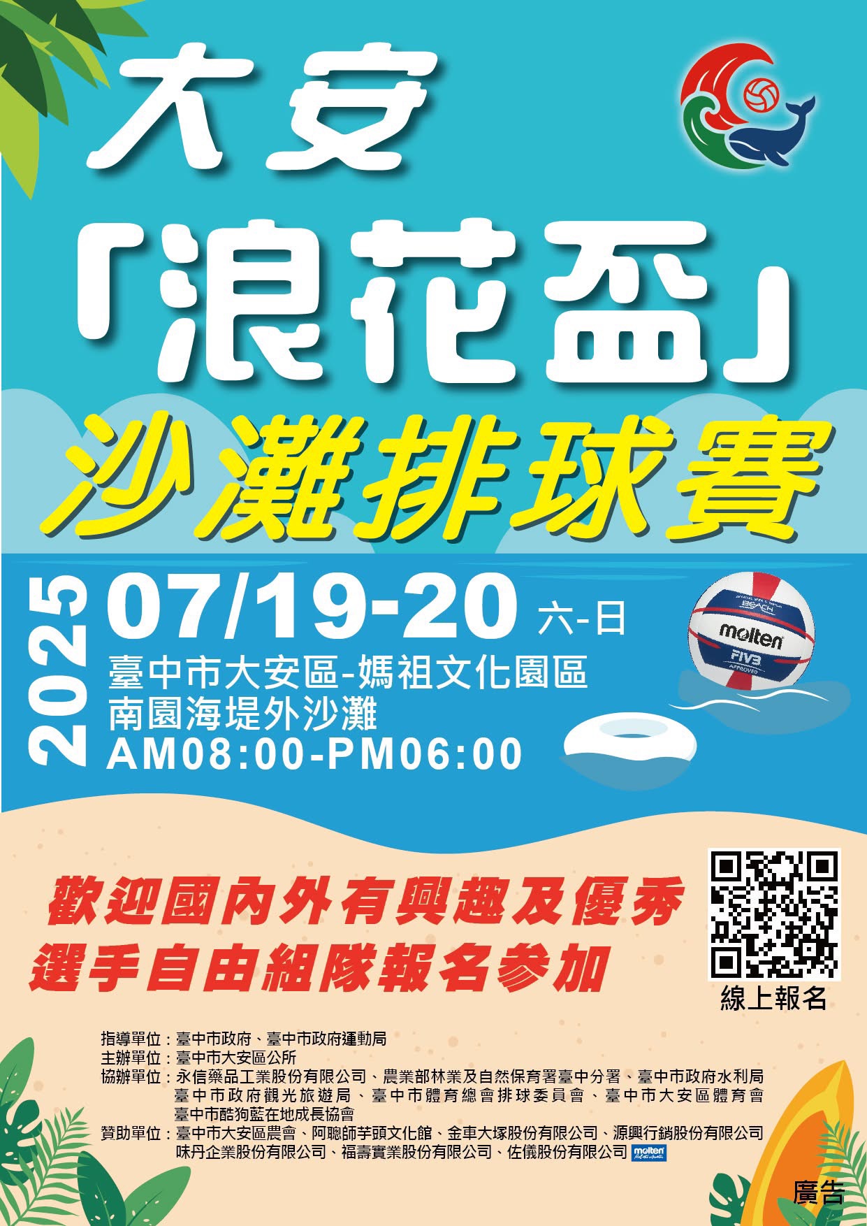 大安區公所訂於114年7月19日(星期六)至7月20日(星期日)假臺中大安區媽祖文化園區南園海堤外沙灘辦理大安「浪花盃」沙灘排球賽活動