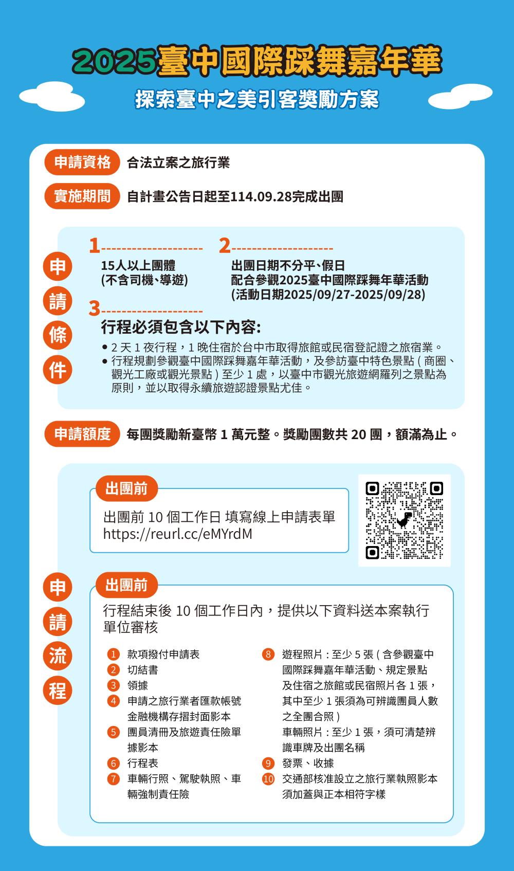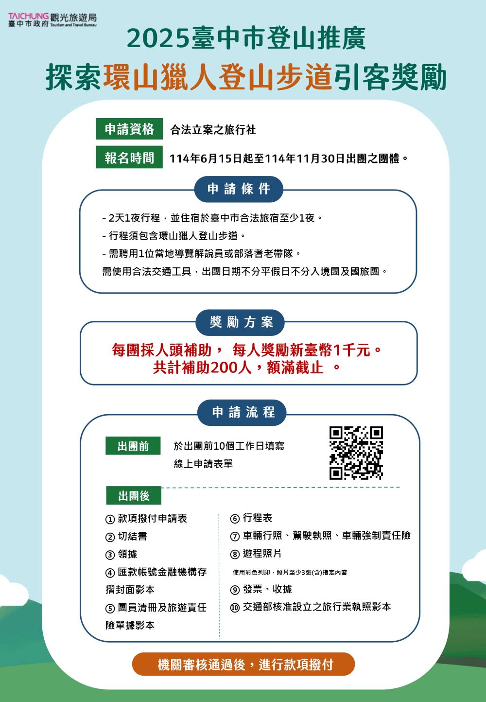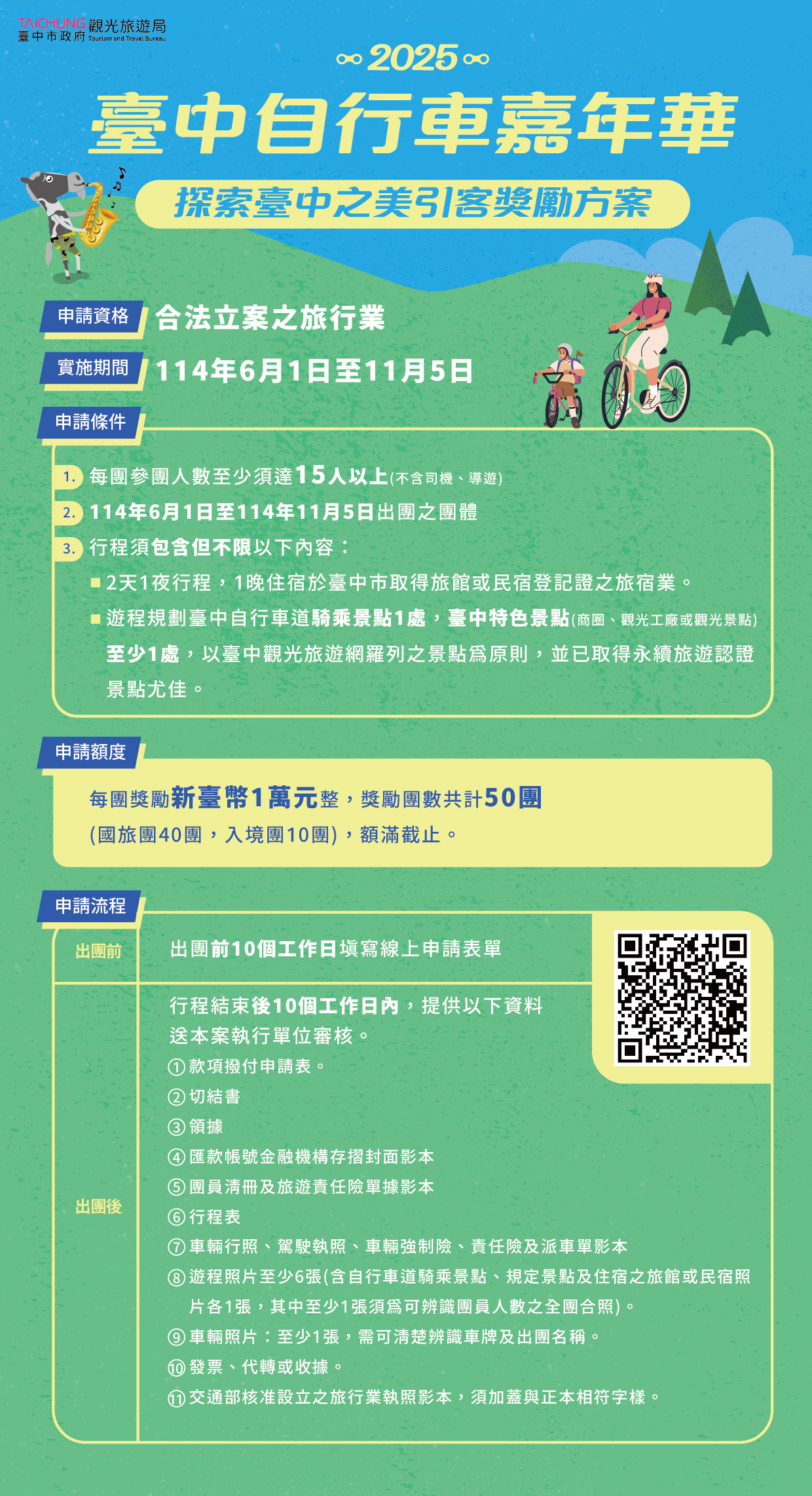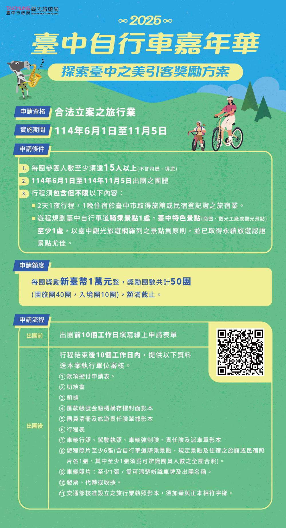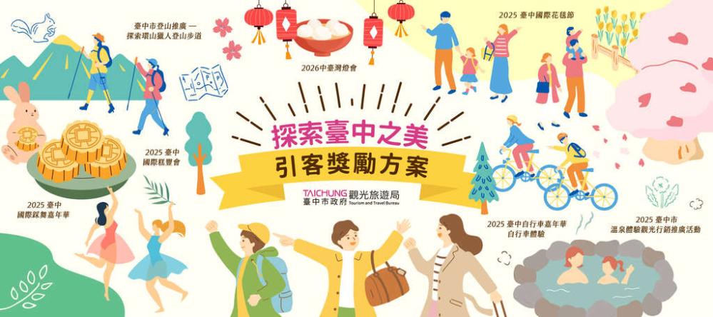 臺中匯聚了「山、海、屯、都」多元的旅遊面貌,吸引著國內外旅人的目光,在現代化的都市風貌下,不僅保留歷史文化底蘊,更擁有豐富的自然景觀,以及精采的活動慶典,為了推廣旅客留宿臺中,深度探索體驗在地特色,臺中市政府觀光旅遊局與旅行社合作推出獎勵方案,從今(114)年5月起至115年3月將陸續舉辦7波主題活動,歡迎旅客前來感受臺中的獨特魅力。