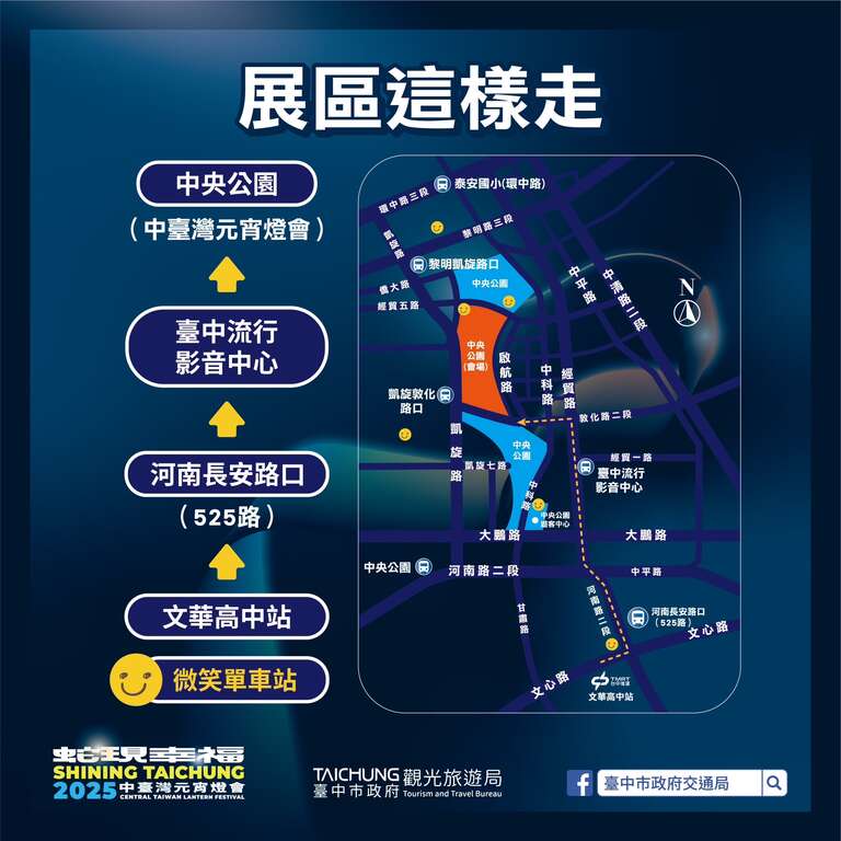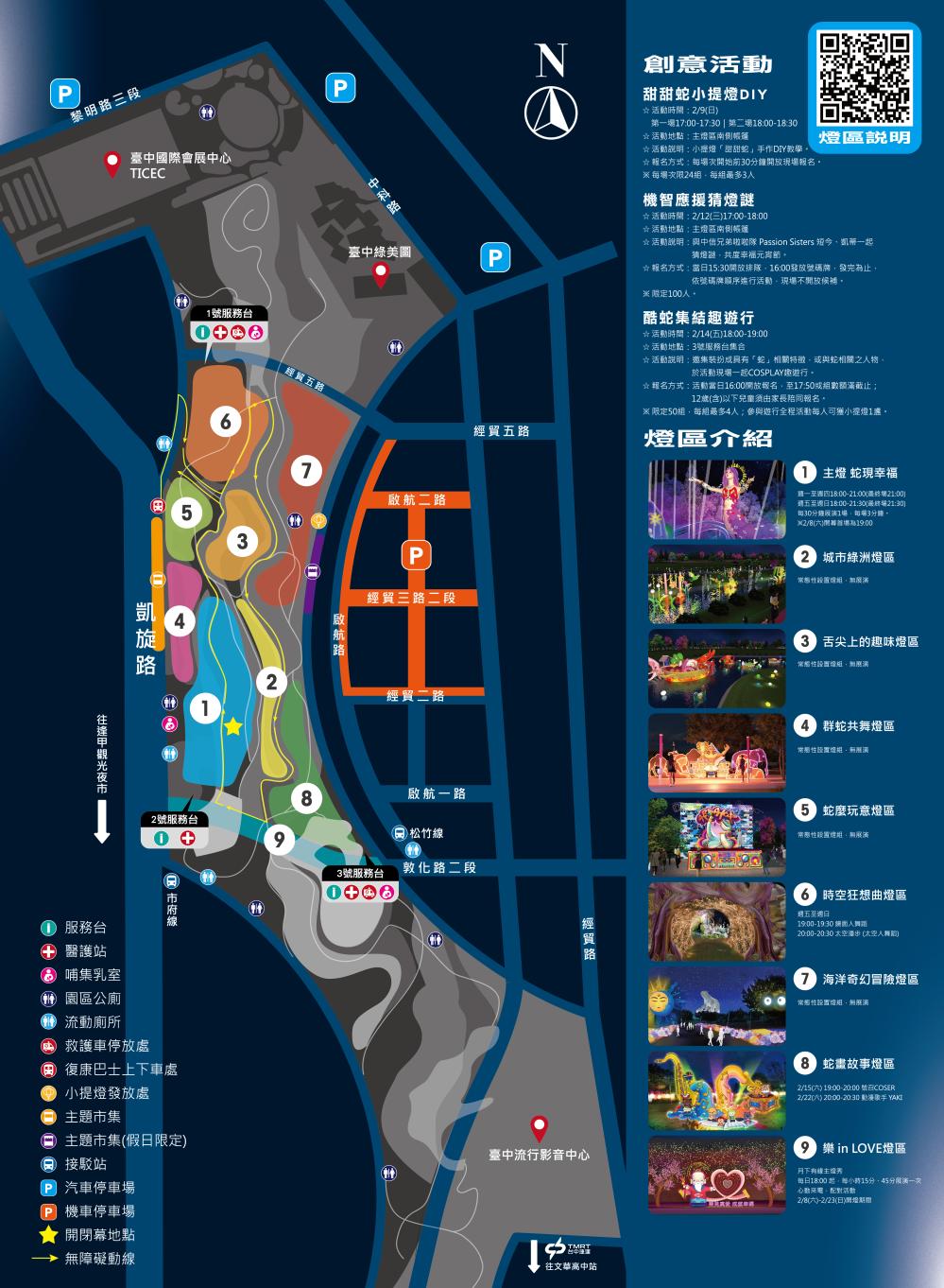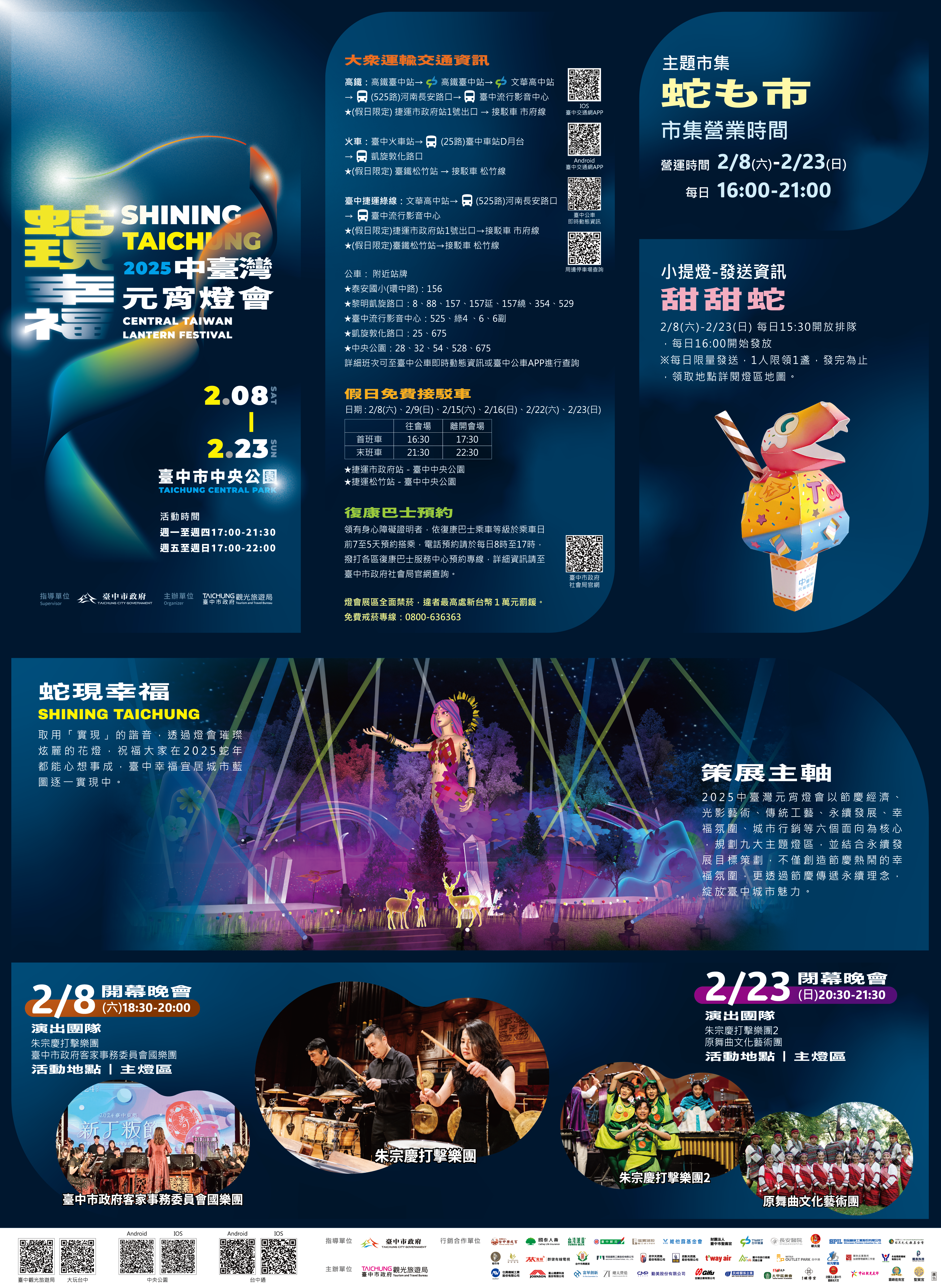 2025中臺灣元宵燈會「蛇現幸福」2/8(六)至2/23(日)於臺中市中央公園盛大登場,以「蛇現幸福」為題,取用「實現」的諧音,祝福大家蛇年心想事成,也代表臺中幸福宜居城市藍圖逐一實現。本屆燈會以節慶經濟、光影藝術、傳統工藝、永續發展、幸福氛圍、城市行銷等六個面向為核心,規劃九大主題燈區,並結合永續發展目標策劃,不僅創造節慶熱鬧的幸福氛圍,更透過節慶傳遞永續理念,綻放臺中城市魅力。