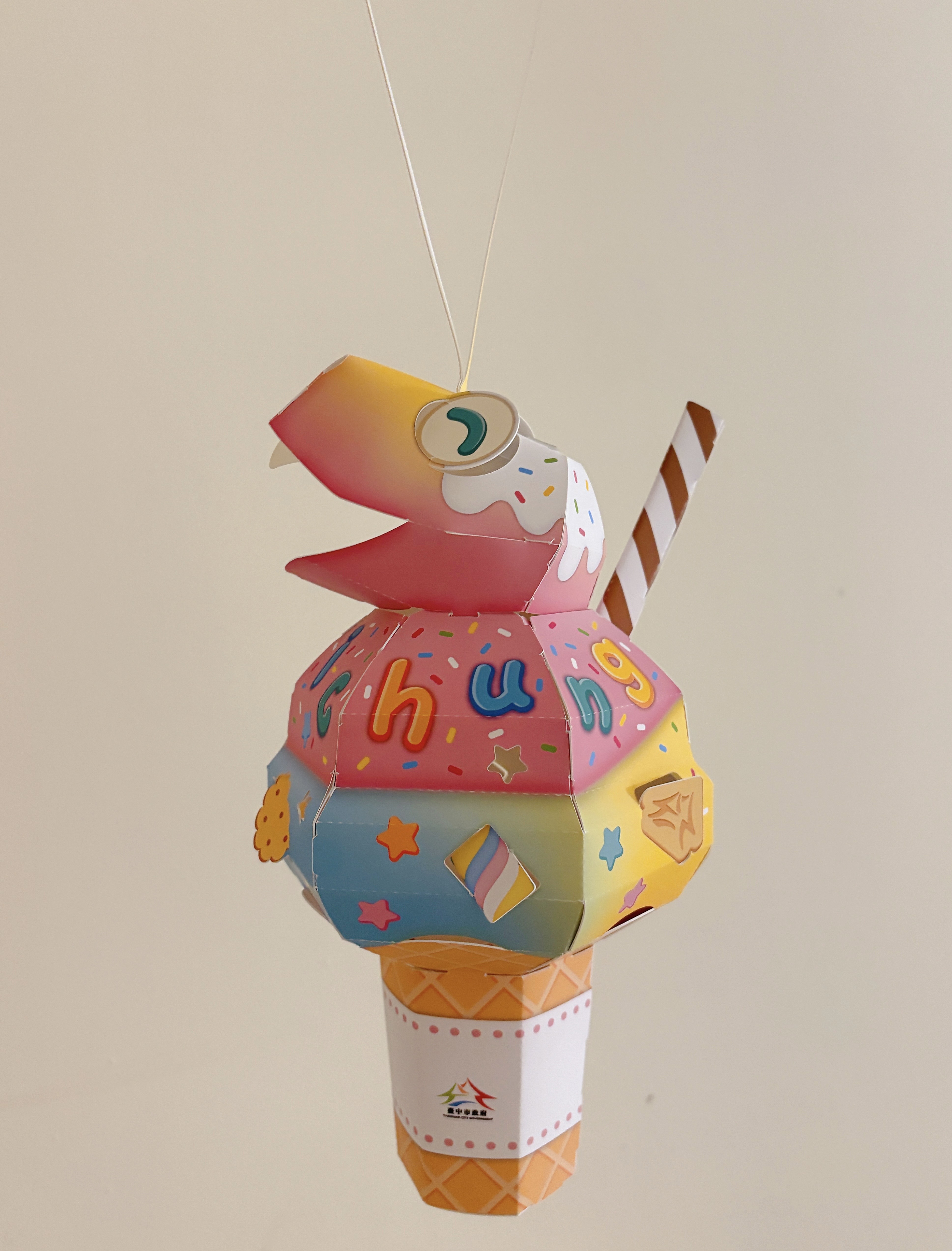 將蛇身設計為粉紅色霜淇淋造型,裝飾五顏六色的可愛配料,以字母軟糖拼出臺中的英文,而甜筒造型的提把則增添趣味性和實用性,便於攜帶,彷彿手裡握著一支美味甜筒,同時也可手提。燈光點亮時,霜淇淋蛇如同融化在夜晚的甜蜜驚喜,喚起童心與幸福感。