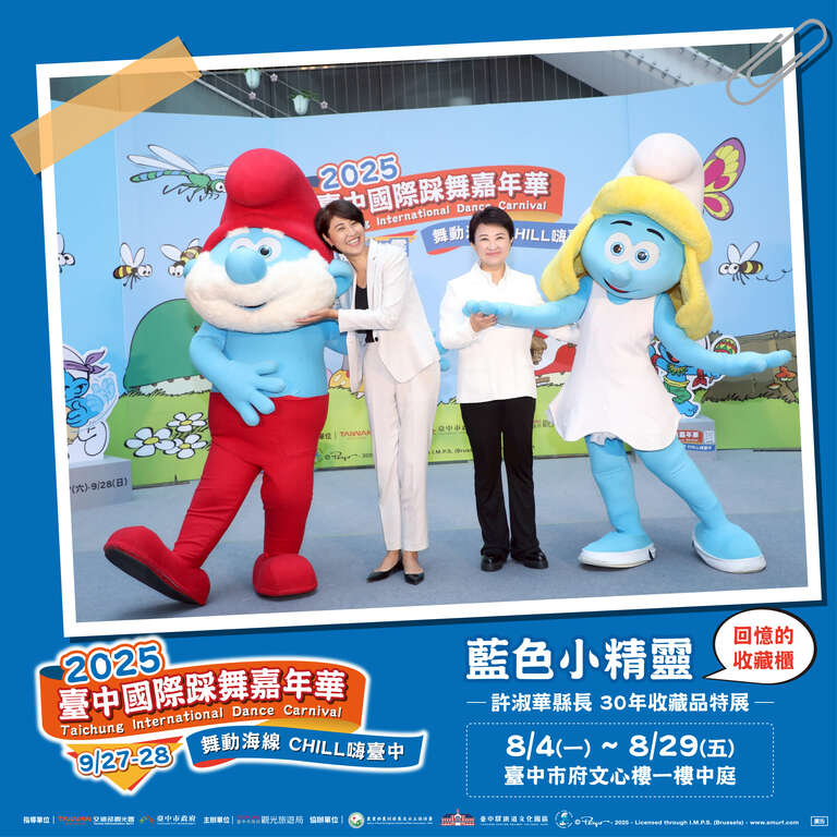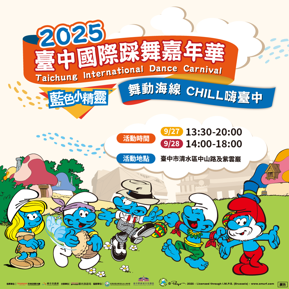 「2025臺中國際踩舞嘉年華」特邀藍色小精靈行銷宣傳,除活動當日將現身清水參與踩舞活動外,藍色小精靈將現蹤台中各地,歡迎全國民眾到台中來尋找可愛的小精靈!