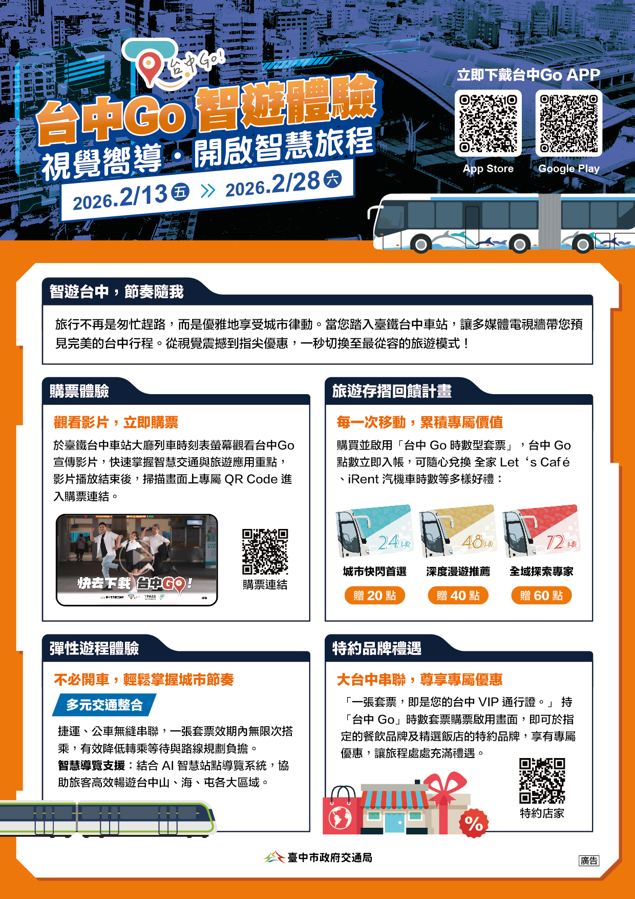 即日起至2026年2月28日於臺鐵台中車站大廳列車時刻表營幕,觀看台中Go宣傳影片,影片播放結束後,只需掃描螢幕上的專屬 QR Code,即可進入購票頁面,選購最符合您行程需求的套票。