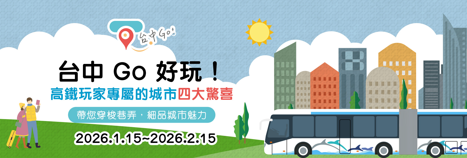 活動說明:旅遊熱潮來襲!【台中 Go 好玩!】攜手高鐵玩家推出限時四大驚喜優惠,從交通、住宿到點數回饋與特約店家好康一次到位,讓你玩台中更輕鬆、更划算,一路玩、一路省!