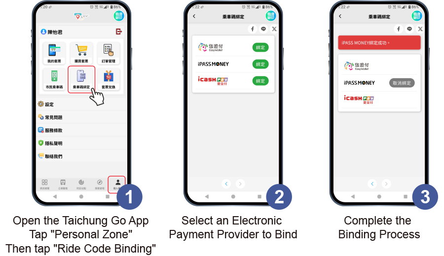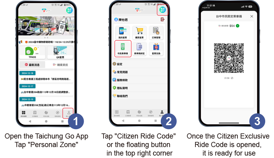 - Method 1: Open the "Taichung Go App", tap "Personal Zone", then tap "Citizen Ride Code" to activate it.