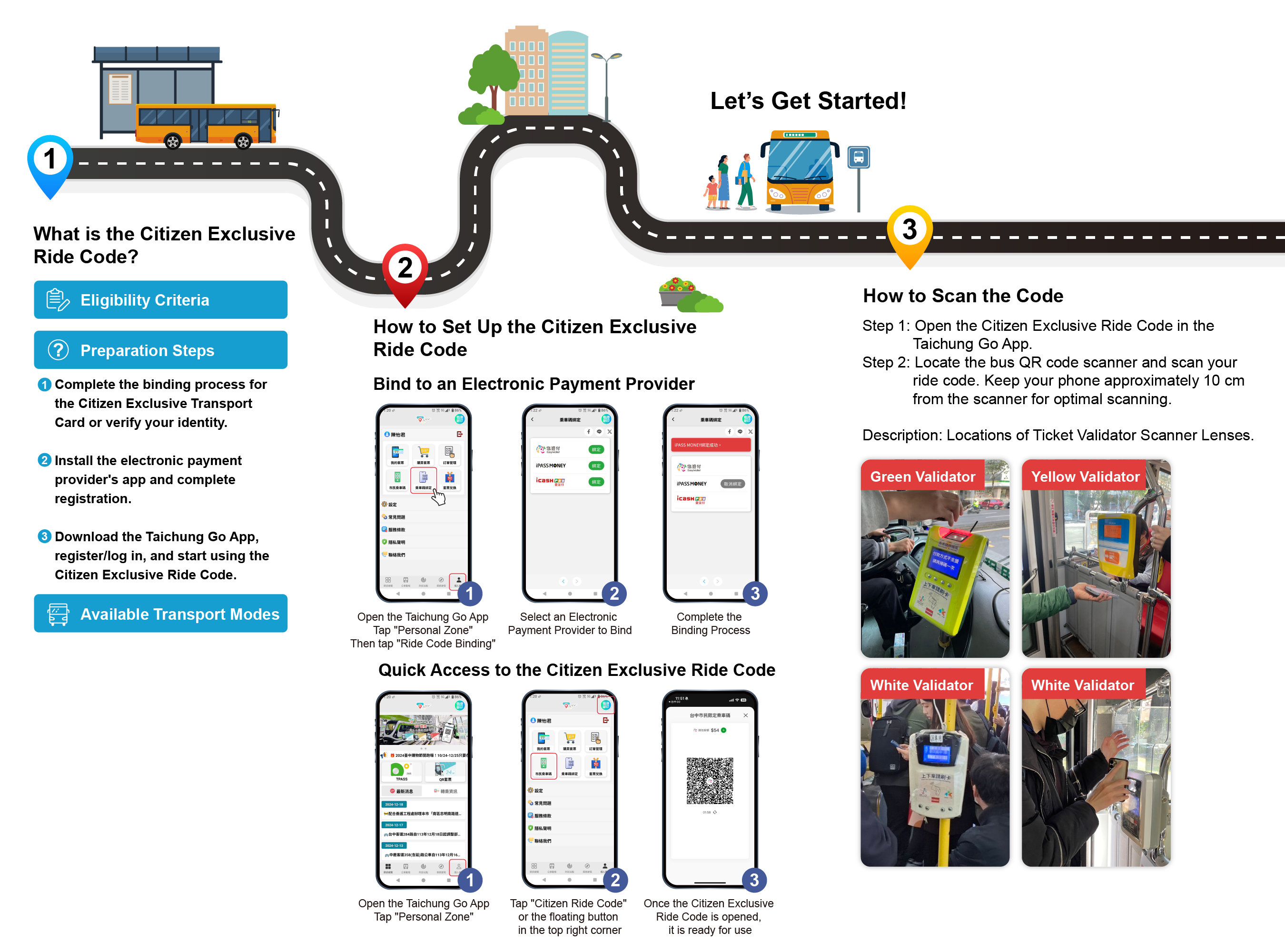 Individuals eligible for the "Citizen Exclusive" transport card benefits can use the Citizen Exclusive Ride Code to board Taichung city buses and enjoy the same "10 km free + a maximum fare of 10 NTD for distances exceeding 10 km" Double Ten Bus Discount as the transport card.
